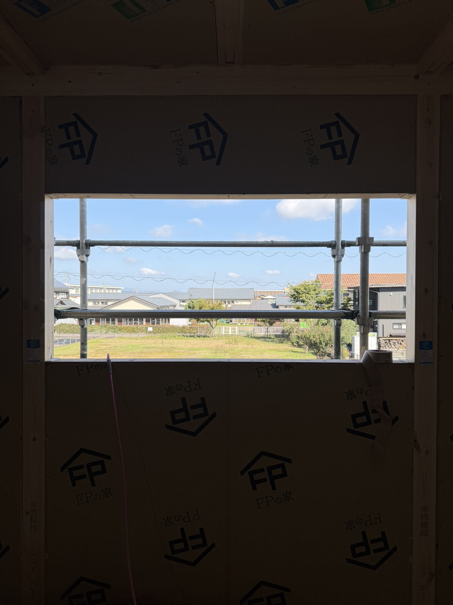 2階の子供部屋の窓になります。ここは見晴らしがいいです。早くサッシを付けてシートを無くしたいところです。