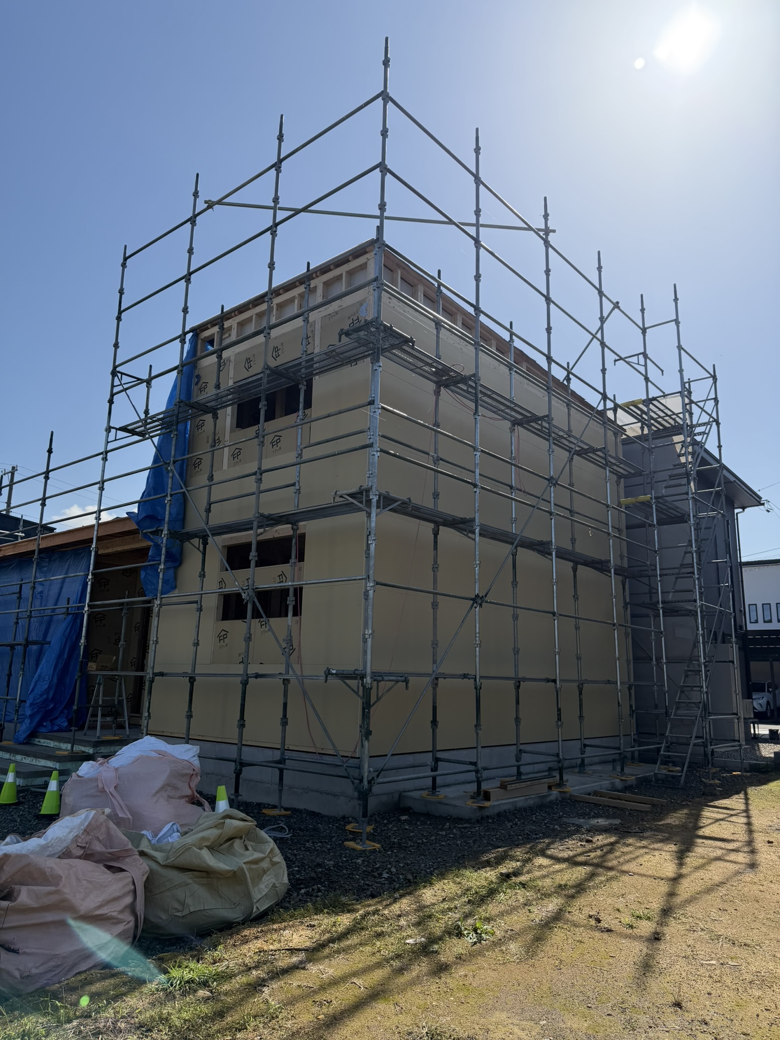 サッシが届いて透湿防水シートを張るまで、ブルーシート養生は続きます。