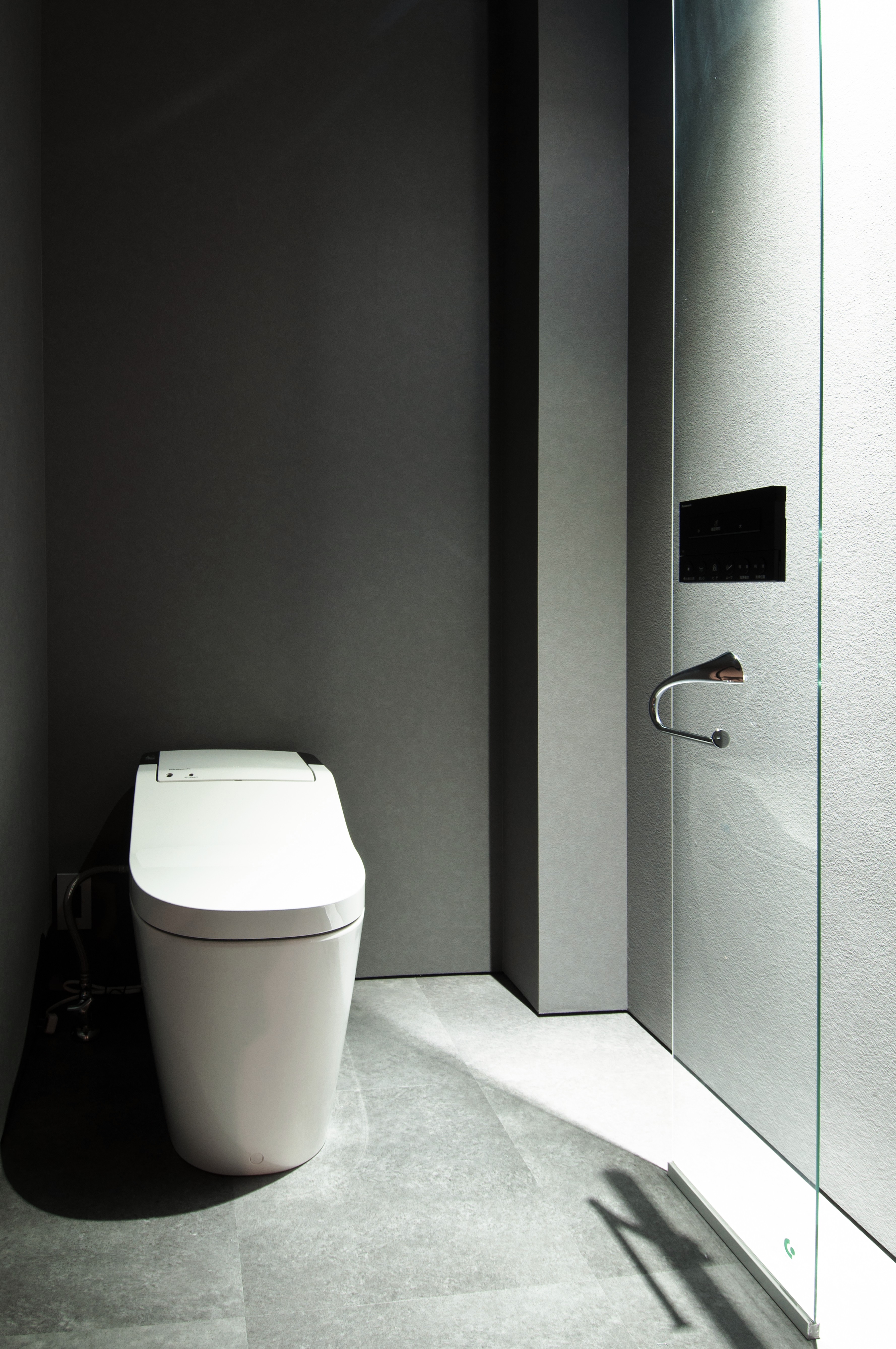 今日は、トイレスペースに「昼白色」の照明を使った事例をご紹介したいと思います。 写真のトイレは、床・壁ともにグレーで統一した、落ち着いたトーンの空間です。右側にはガラス板で仕切った壁を立て、その面にペーパーホルダーとリモコンをまとめて取り付けています。余計な物を見せないことで、よりシャープな印象になるように計画しました。 このクールな雰囲気に合わせて、照明も白っぽい昼白色を採用しています。ダウンライトをガラスの裏側に埋め込み、ガラス越しに光がにじむような見え方にすることで、間接照明のような柔らかさと、どこかギャラリーのような雰囲気を演出しています。 また、このトイレの右奥には、パイプスペースの出角ができてしまう計画でした。そこで、そのラインに合わせてガラス板の壁を設けることで、凸凹のないすっきりとした壁面に見せています。設備的な都合から生まれる「違和感」を、デザインとして取り込んだ例と言えるかもしれません。 ガラスの仕切りは、視線が奥まで抜けるため、実際の広さ以上に空間を広く感じさせてくれる効果もあります。昼白色のクリアな光とガラスの抜け感を組み合わせることで、コンパクトなトイレでも、ほどよく開放感のあるスタイリッシュな空間に仕上がりました。 福井で注文住宅や工務店のことなら(株)ライフ・コア デザインオフィスにお任せください。