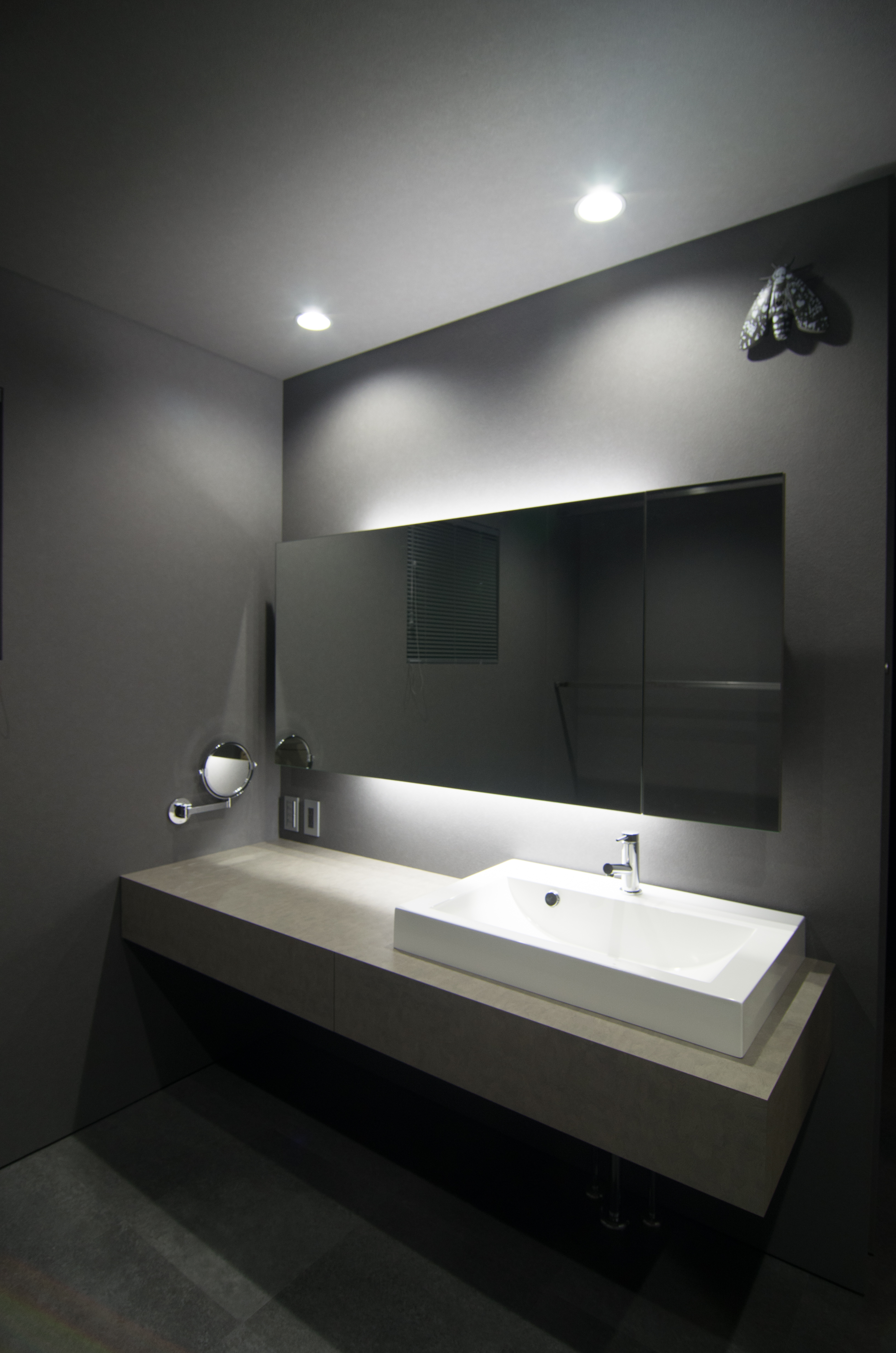 今日は、昨日に続いて昼白色の照明を使った事例をご紹介したいと思います。 こちらは、寝室横のウォークインクローゼット内に設けたメイクカウンターです。 毎日のメイクや身支度がしやすいよう、肌の色味やメイクの発色が分かりやすい昼白色のダウンライトを採用しました。 空間全体はグレーで統一し、ミラーは壁から少し浮かせたような納まりにして、間接照明の光で見せています。 エッジの効いたシャープなデザインに、昼白色の白っぽい光がよくなじみ、落ち着きのあるクールな雰囲気のメイクスペースになったと思います。 福井で注文住宅や工務店のことなら(株)ライフ・コア デザインオフィスにお任せください。