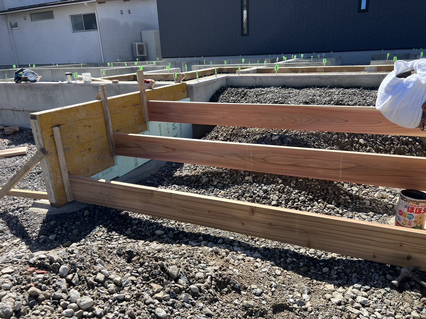 福井 高気密高断熱 ライフ・コアデザインオフィスの本日のブログです。 今日は、午後からお客様宅訪問、家具のリフォーム工事立会い。夕方に、施設に訪問してピクチャーレールと手すりを付ける内容で打合せ。その他は経理の仕事と見積もり作業でした。 越前市の現場は、基礎屋さんポーチの型枠工事に専念しています。 スタイロフォームを当てているのは、後からほじってコンクリートの段を凹ますためです。 手間がかかるデザインにしたものですから、ご苦労をかけております。 息子は、アンカーの垂直を出す作業を行いに行きました。 今週で、なんとか基礎に関する工事は終わらせたいと思います。 福井で注文住宅や工務店のことなら(株)ライフ・コア デザインオフィスにお任せください。