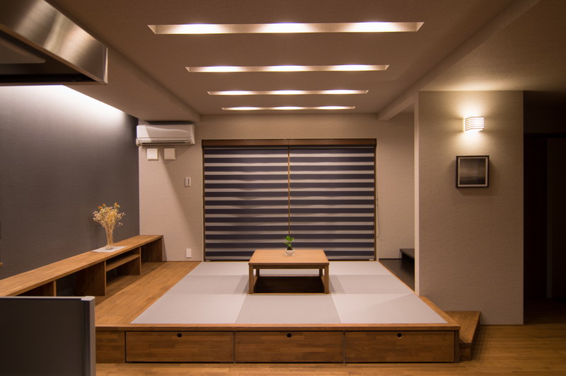 今日は、天井を掘り込んだダウンライトを採用したタタミリビングの事例をご紹介したいと思います。 こちらは、二世帯住宅の親世帯側のリビングとして設計したタタミリビングです。 タタミコーナーは小上がりにすると、どうしても天井が低く感じられますので、一部だけ天井を持ち上げて、そこに照明をまとめて納める計画にしました。 横長のボックスを天井に掘り込み、その中にダウンライトを仕込むことで、ひとつの大きな照明のように見えるデザインです。 光が天井面に広がるので、タタミに座ってもまぶしくならず、圧迫感の少ない落ち着いた明るさになりました。 タタミリビングの横にはダイニングテーブルを配置する計画ですので、この光のラインがちょうどテーブルの芯に揃うように位置を決めています。 くつろぎのタタミスペースと、食事をするダイニングを、同じ照明のリズムでゆるやかにつなぐ役割もあります。 テレビを置くためのカウンターテーブルの上には「コーニス照明」も設置しました。 壁面をやわらかく照らすことで、暗くなりがちなグレーの壁が、夜は心地よいアクセントウォールとして楽しめます。 ただ明るくするだけでなく、天井の形と光の入れ方を少し工夫することで、デザイン性と実用性を兼ね備えた、居心地の良いタタミリビングになったと思います。 福井で注文住宅や工務店のことなら(株)ライフ・コア デザインオフィスにお任せください。