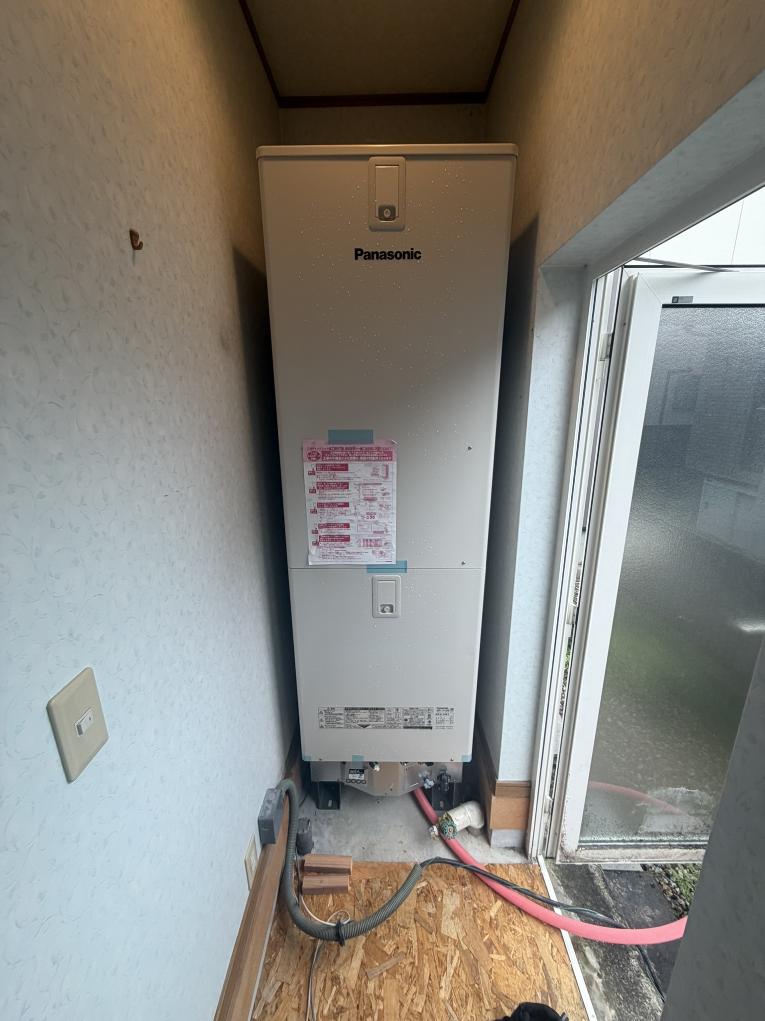今日は朝のうちに越前市のお客様宅へ伺い、エコキュートのタンク搬入作業を手伝ってきました。もともと室内に温水器が設置されていたお宅で、今回もタンクは室内、室外機は外へ配管を通す形での交換です。朝から少し緊張感のある作業となりました。 まずは無事に入るかが勝負でした 今回いちばん気を使ったのは、やはりタンクの搬入でした。横にある勝手口からは入らないため、玄関から運び入れることになりましたが、背が高いので下がり壁をかわすのもひと苦労です。毛布に載せて慎重に動かしながら、向きを変えたり横にしたりして、少しずつ進めていきました。 特に土間へ下ろす場面は、奥に人が入ると出られなくなるので、動く順番まで考えながらの作業でした。最後は荷物を運ぶときのバンドを肩に掛けて、3人がかりで持ち上げて下ろしました。無事に納まったときは、みんなでほっとした瞬間でした。 室内に置く良さもあります 搬入や入れ替えの大変さはありますが、室内にタンクを置くことには、やはり良さもあります。特にFPの家のように断熱性の高い住まいでは、室内の温度が安定しやすいため、タンクの保温にもよい影響があります。 お湯が冷めにくければ、そのぶん温め直しの回数も抑えられますので、電気代の面でも助かるところがあります。設備の置き場所ひとつでも、家の性能が日々の暮らしにきちんとつながっているのだなと感じます。 納める時も、その先も大事です ただ、今日の作業をしながらあらためて思ったのは、設備は今きれいに納まればよい、というだけではないということです。今回のように室内設置は使い勝手の面でメリットがある一方で、将来の交換時にはそれなりに手間もかかります。 だからこそ、その家にとって何がいちばんよいかを、その時だけでなく先のことまで考えて決めていくことが大切だと思います。見えにくい部分ではありますが、そういう積み重ねが住まいの安心につながっていくのだと思います。 今日は朝からなかなか力のいる作業でしたが、無事に納まってほっとしました。こうした設備工事も、使いやすさと将来のことの両方を考えながら進めていく大切な仕事だと、あらためて感じた一日でした。 設備の入れ替えや家づくりのことで気になることがありましたら、どうぞお気軽に公式LINEからご相談ください。実際の使い方やその先のメンテナンスまで含めて、丁寧にお話しさせていただきます。