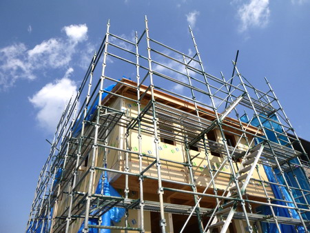 朝は冷え込んでいましたが、日中は気持ちのよいお天気で、包んであったブルーシートをめくっては、パネルの固定と筋違プレートの取り付けに入りました。