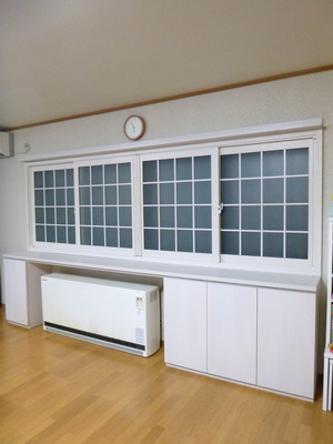 こちら以前に、内窓としてウッドワンの無垢でできた「MOKUサッシ」を入れた現場ですが、その窓の下にピッタリの家具工事を設計して作らせていただいたものです。蓄暖は動かすと費用がばかにならないのでそのままの位置で。あとは窓の上に飾り棚も作りました。