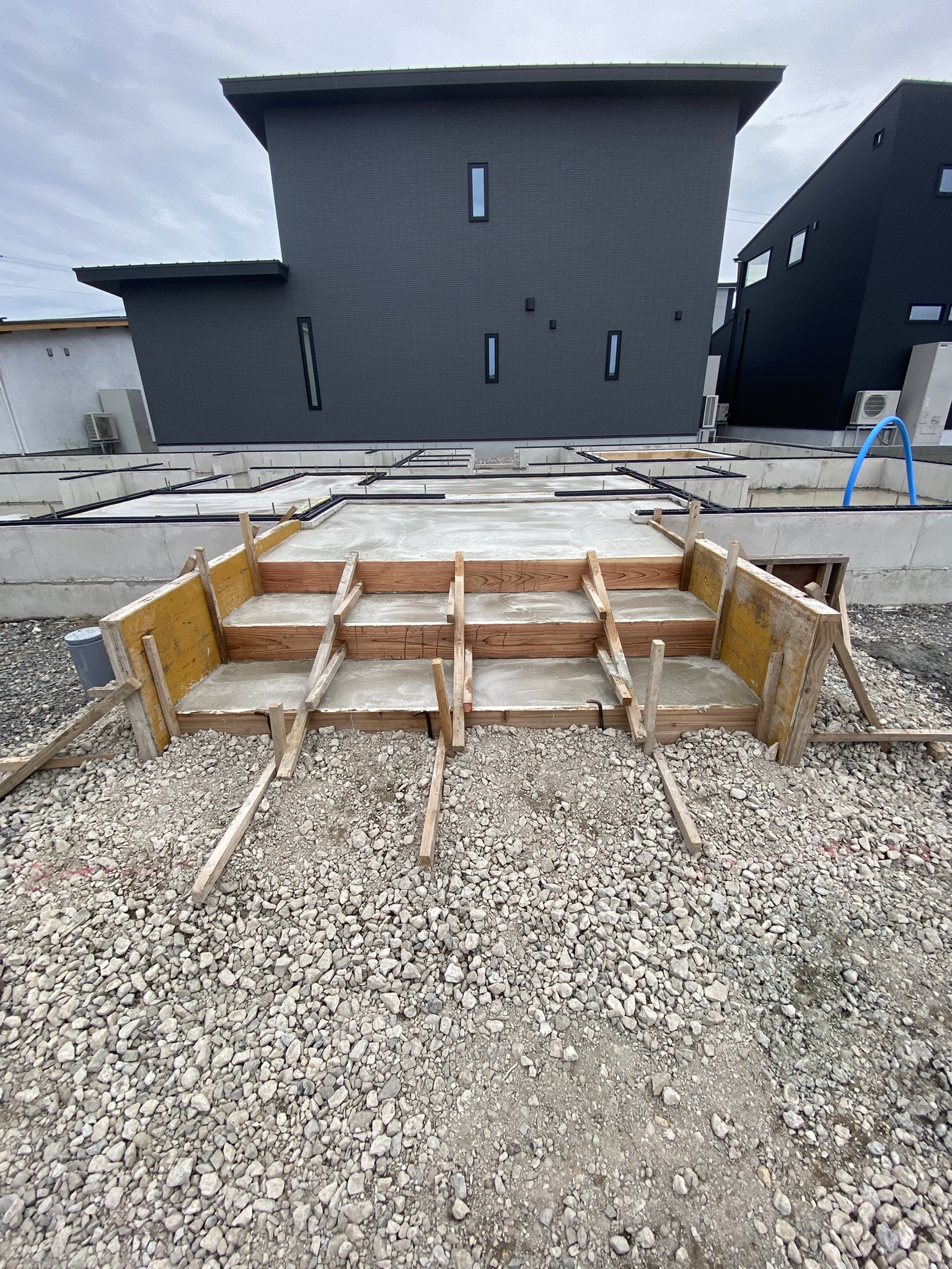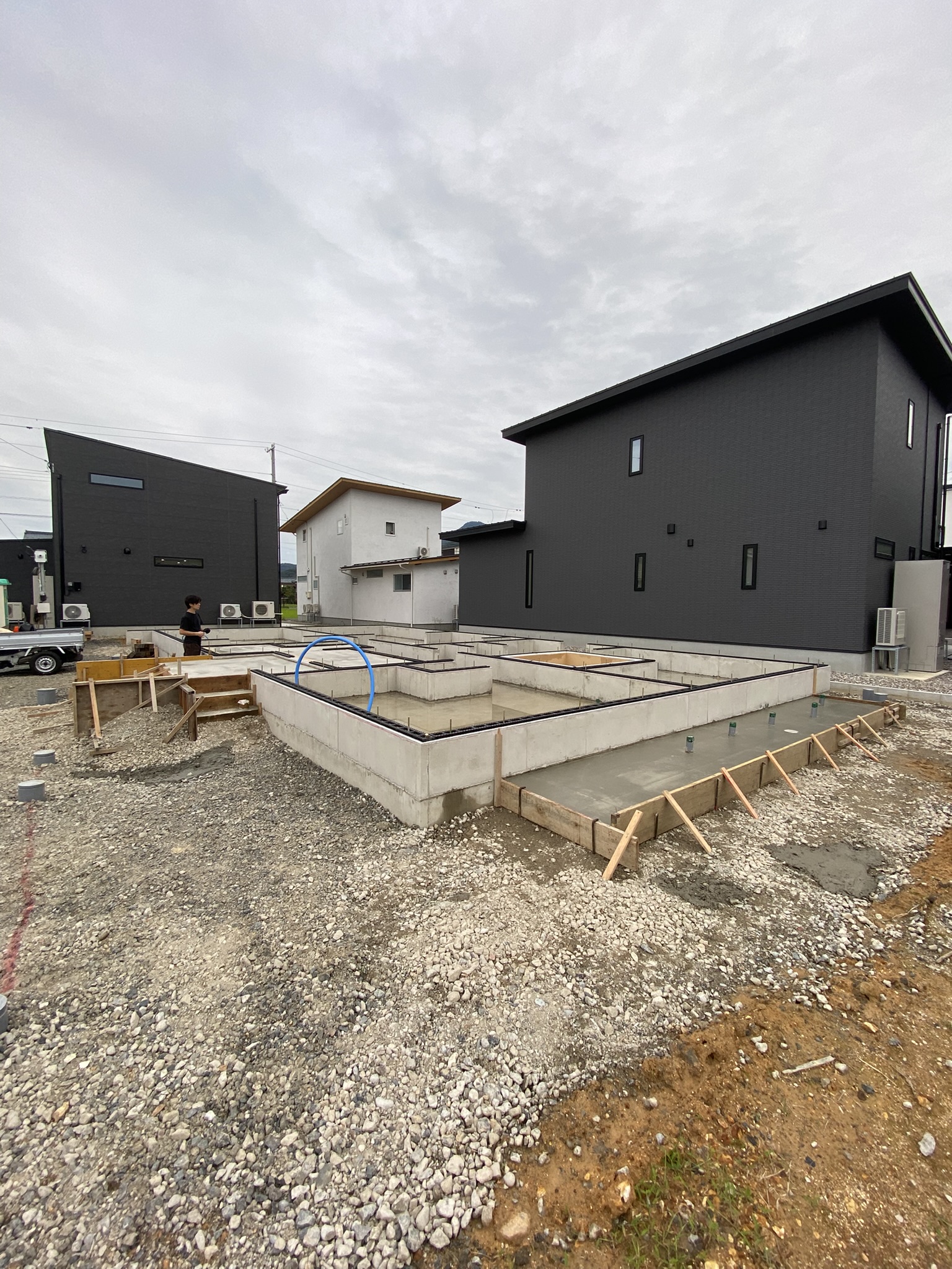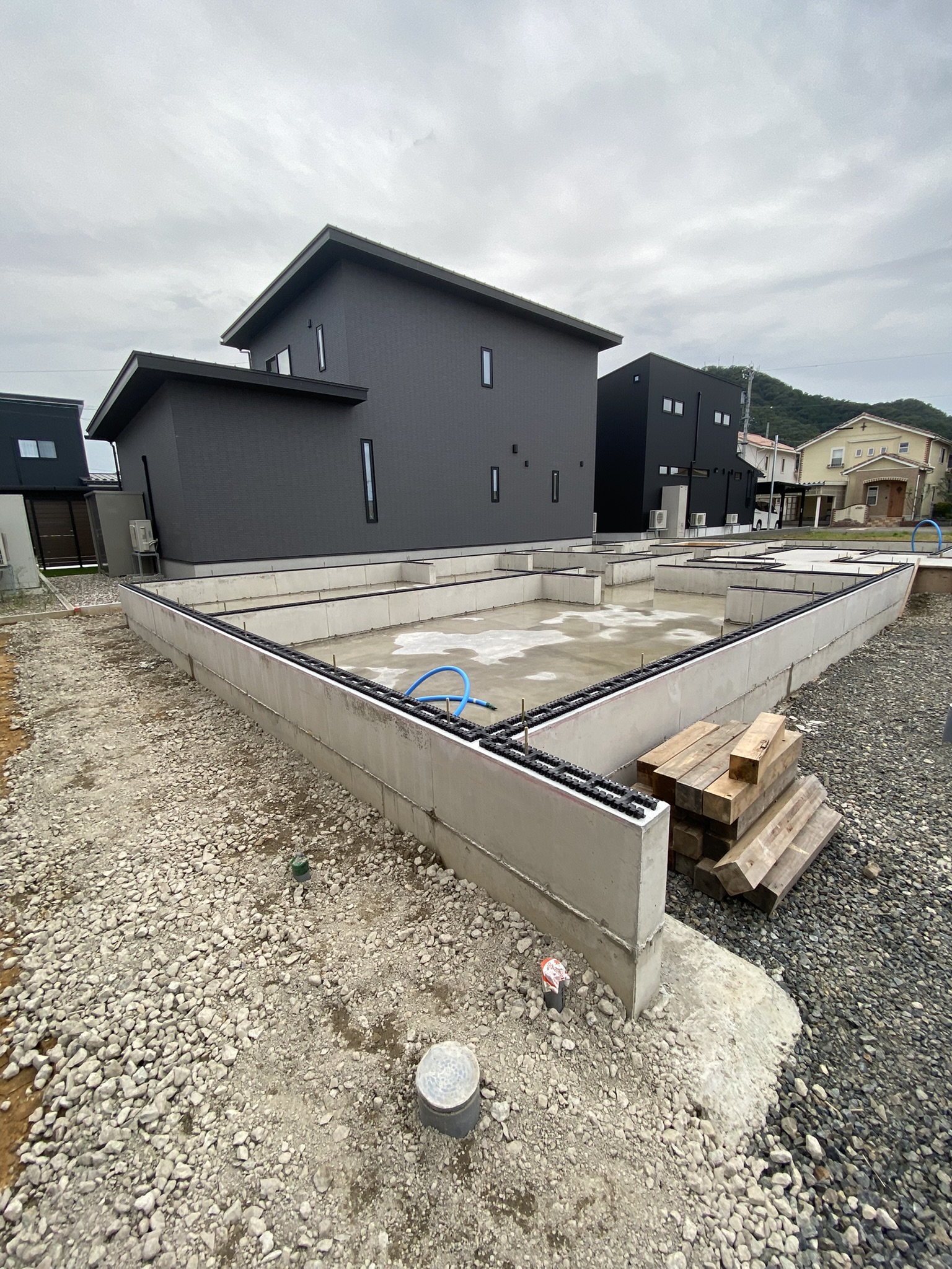 今日は、朝一に基礎屋さんが後施工のコンクリート打設も行いました。