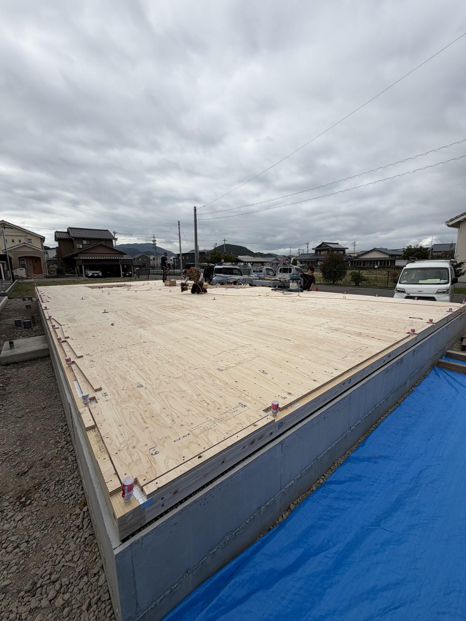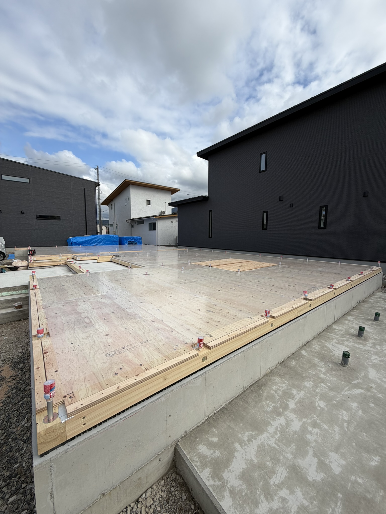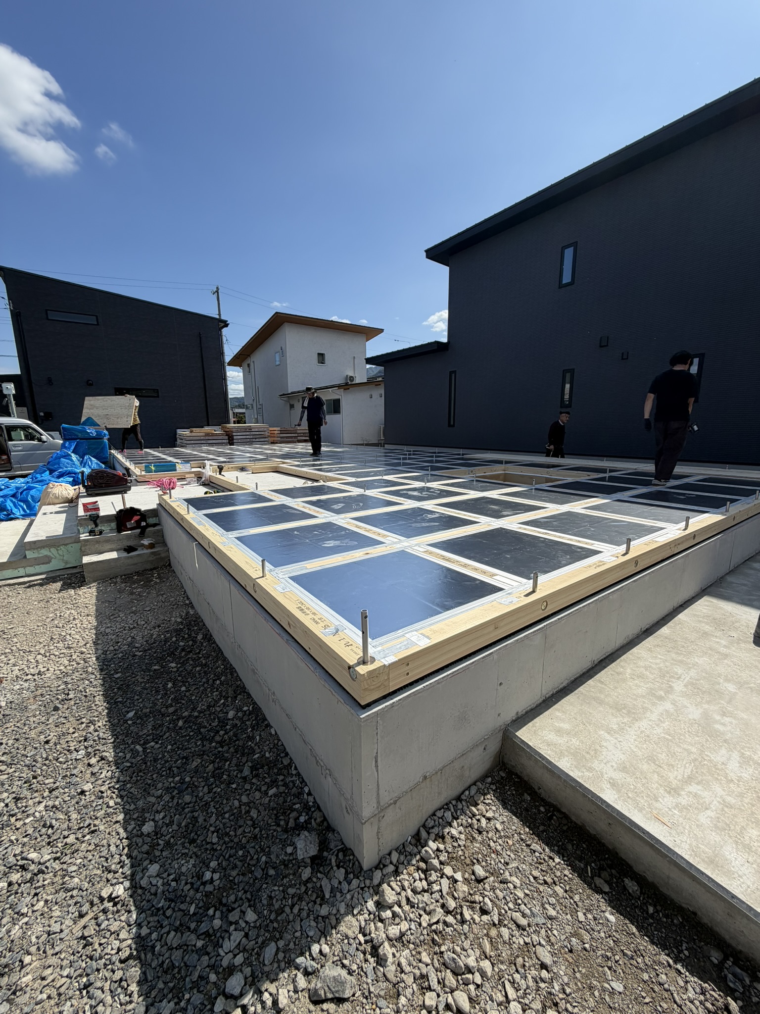 こちらは、土台・大引間にFPパネルを落とし込んで固定。その後気密テープを施工したところです。