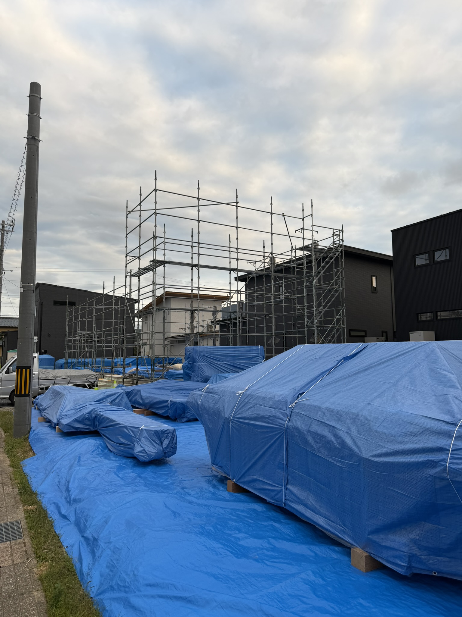 足場でわかるように、手前側が2階建てになります。