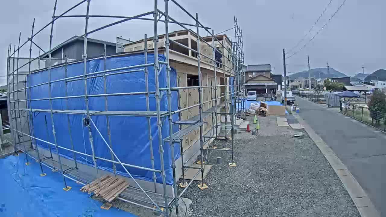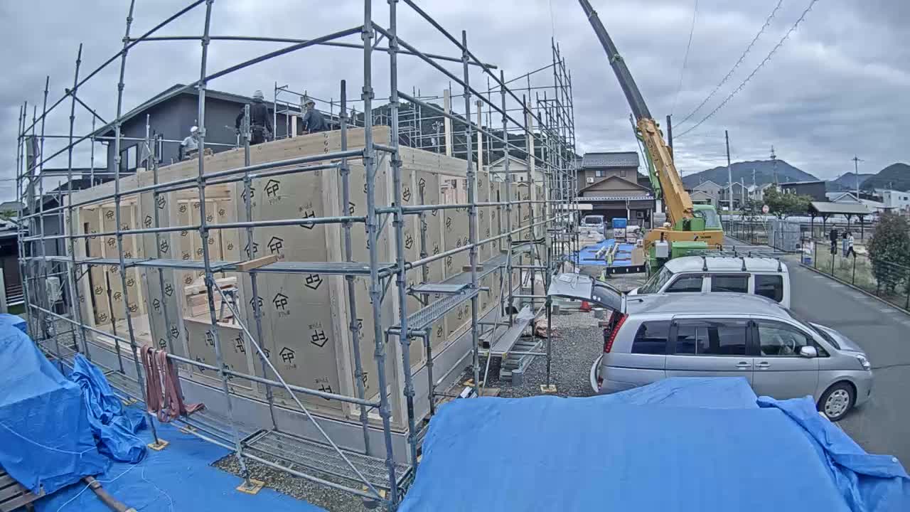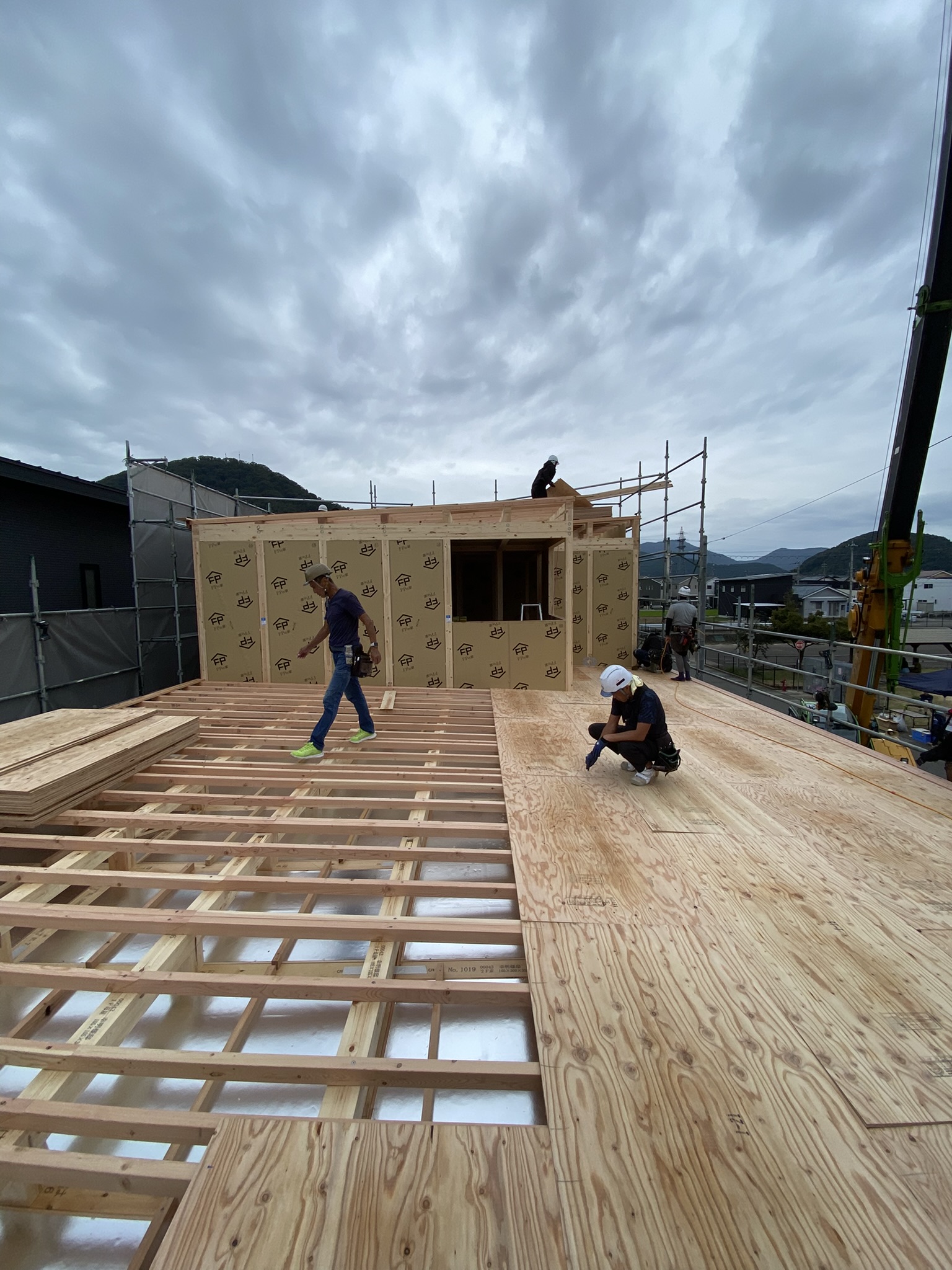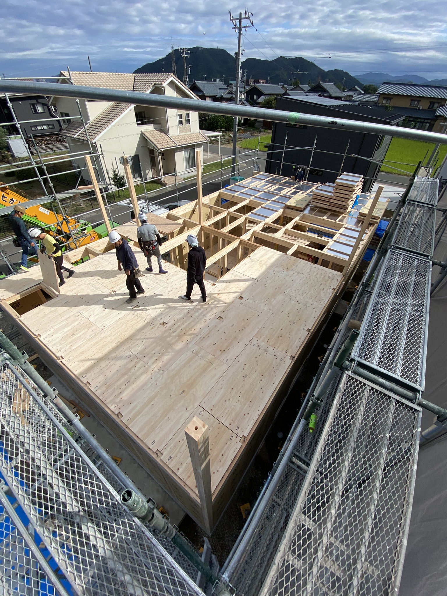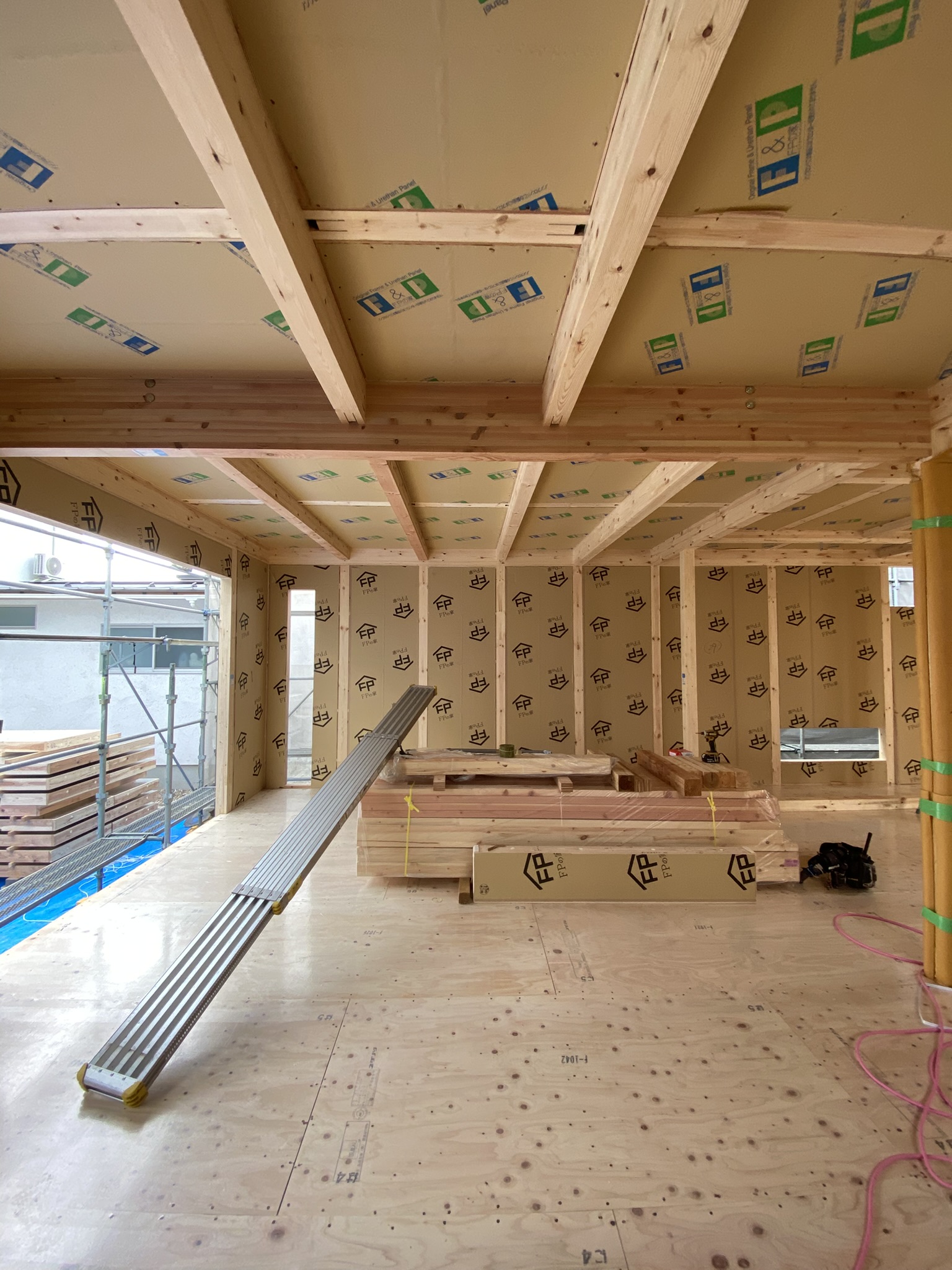 建て方時点で、壁パネルにより建物も垂直に立ち、柱のピンを打つことで、すでに壁体力が発生しているようなものですし、梁間のパネルでも、水平剛性が出ているといえます。