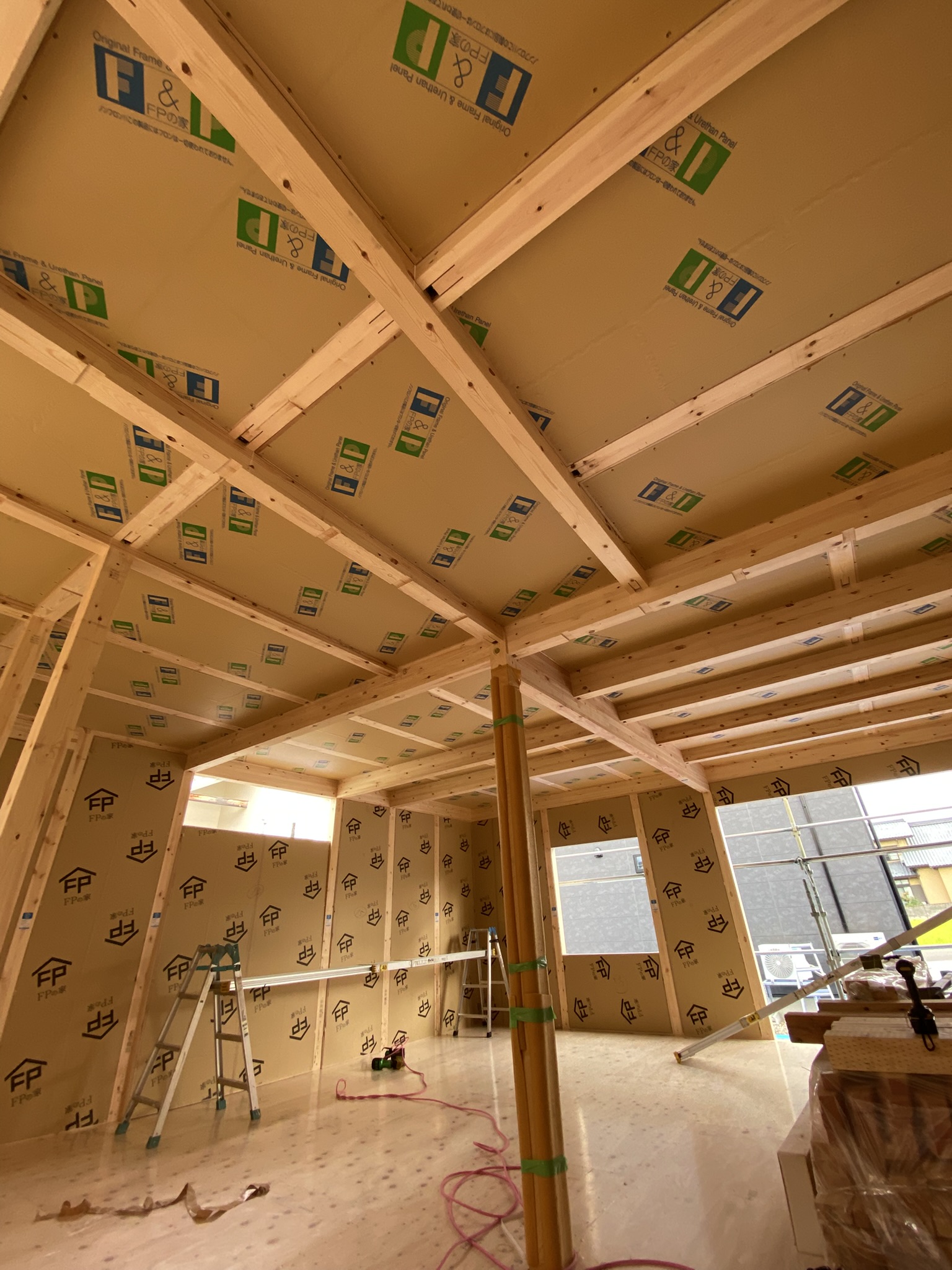 下屋部分のFP天井パネルが落とし込まれたところを、下から写したものです。