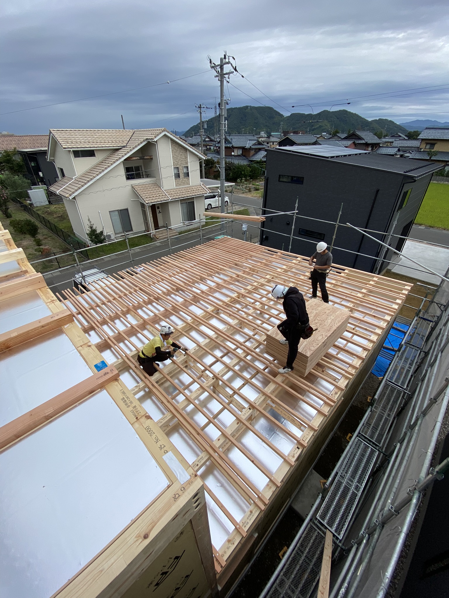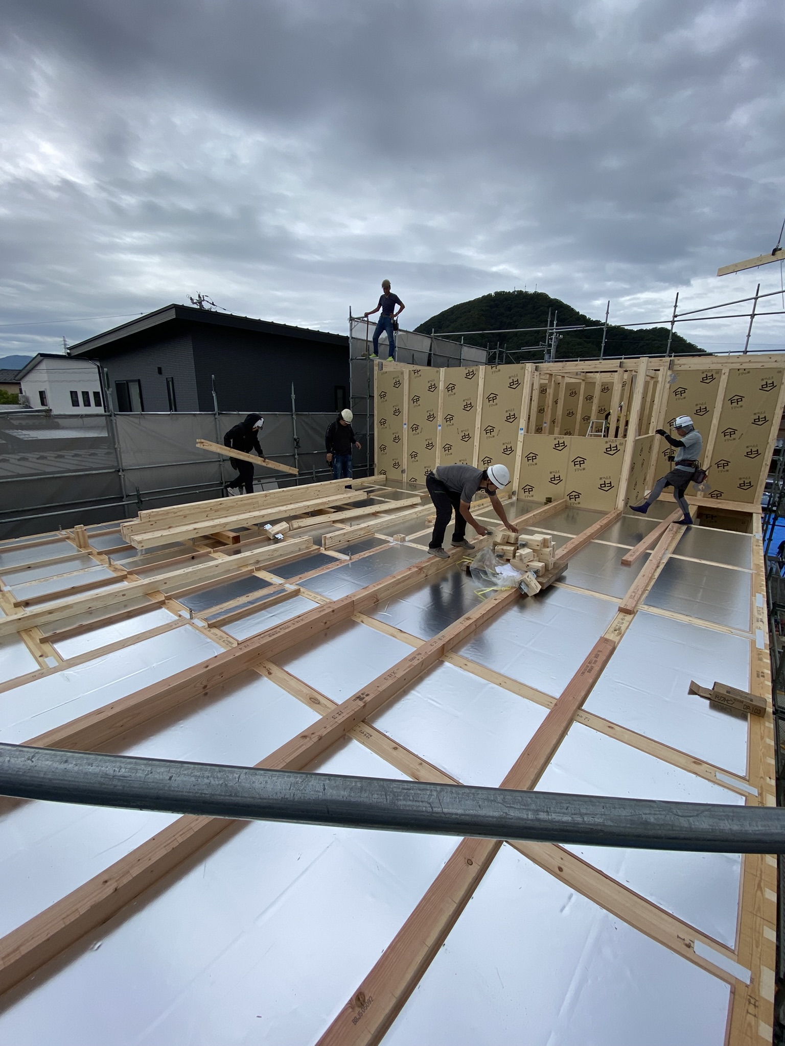 軒先が60㎝ほど出るのですが、積雪にも耐えられるように、334㎜ピッチの垂木のさらに間にも軒先だけ追加して入れています。