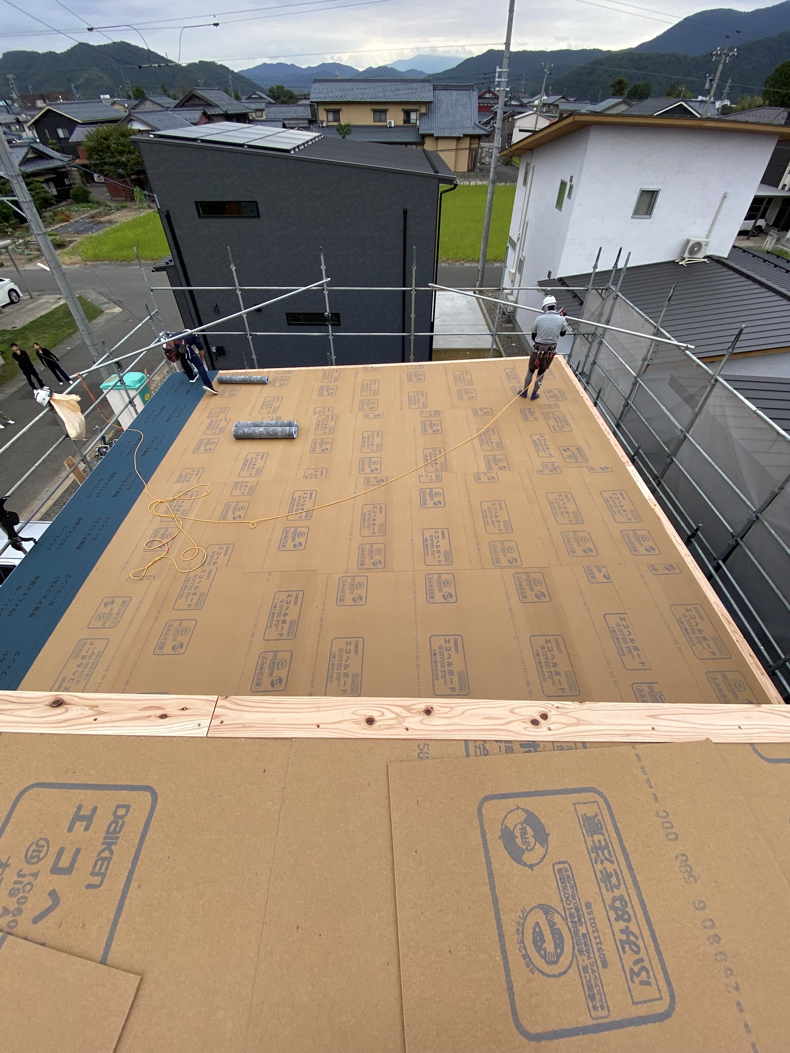 板金屋さんも、雨が降る前にと駆けつけてくれて、追っかけゴムアスファルトルーフィングを敷き始めてくれています。