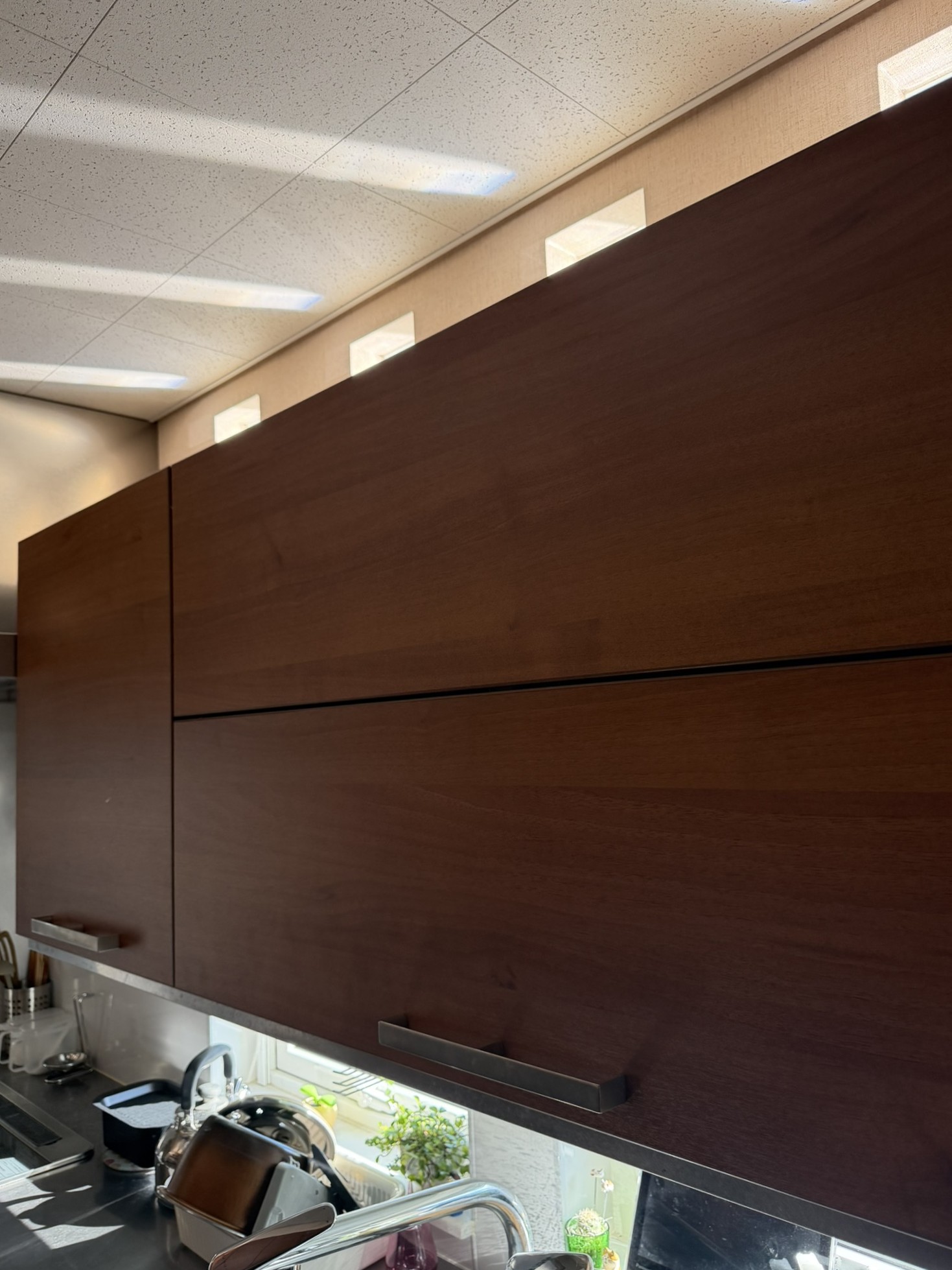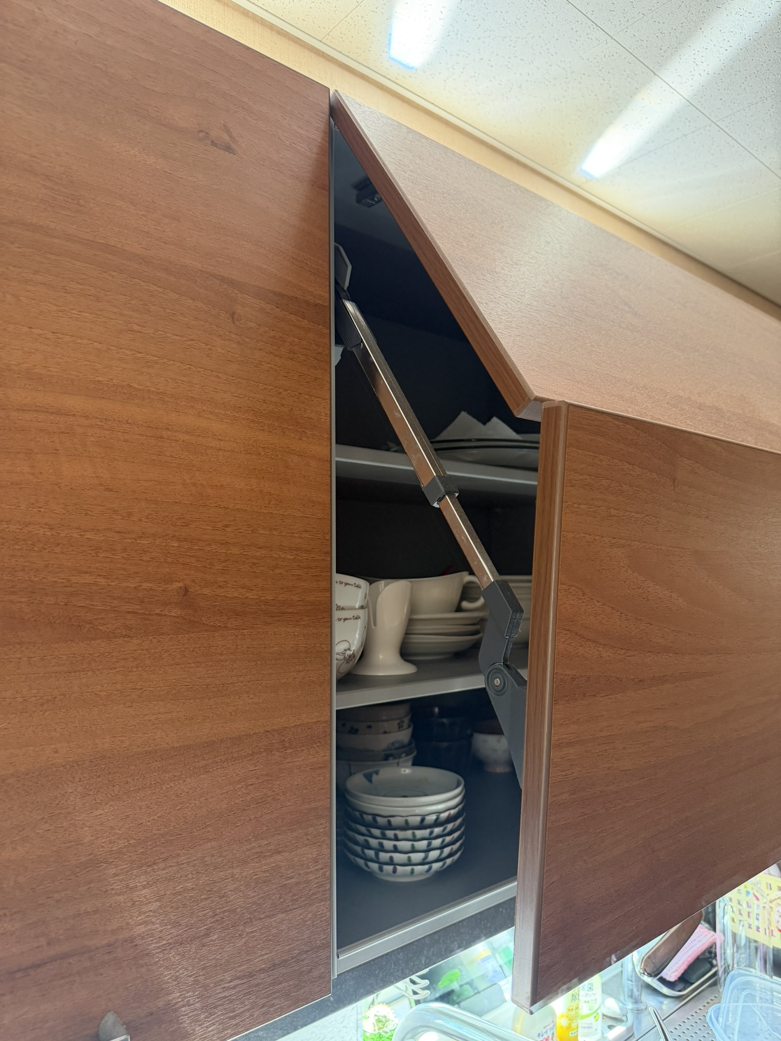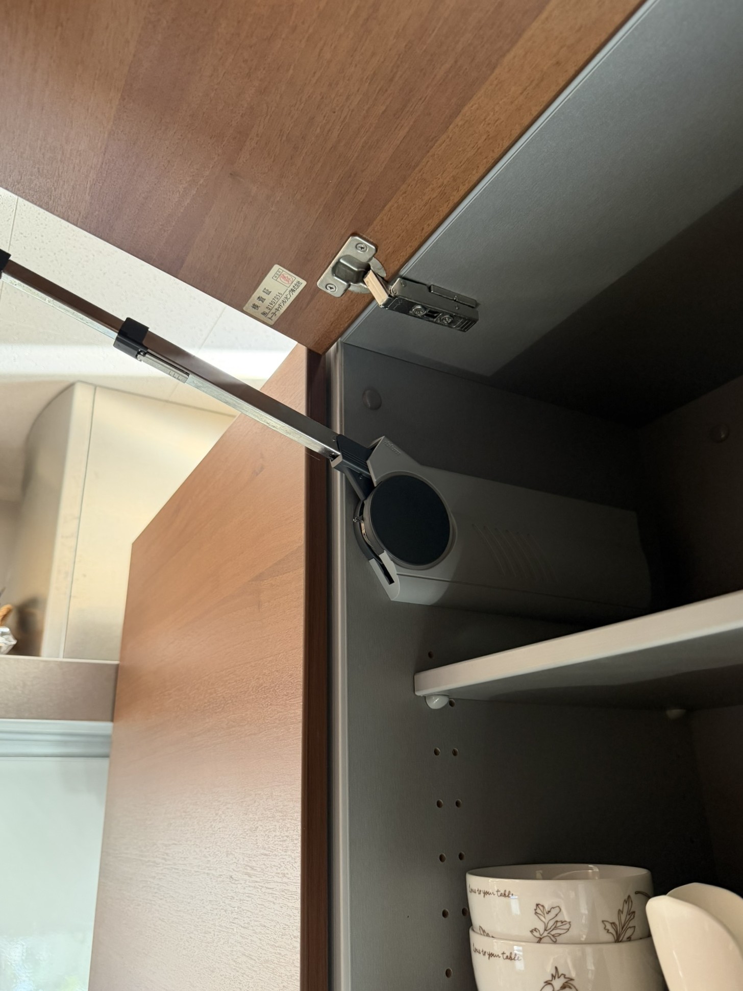 その際、トーヨーキッチンの壁付け収納にある跳ね上げ式扉のダンパーが弱くなったとのことで、部品交換も行いました。